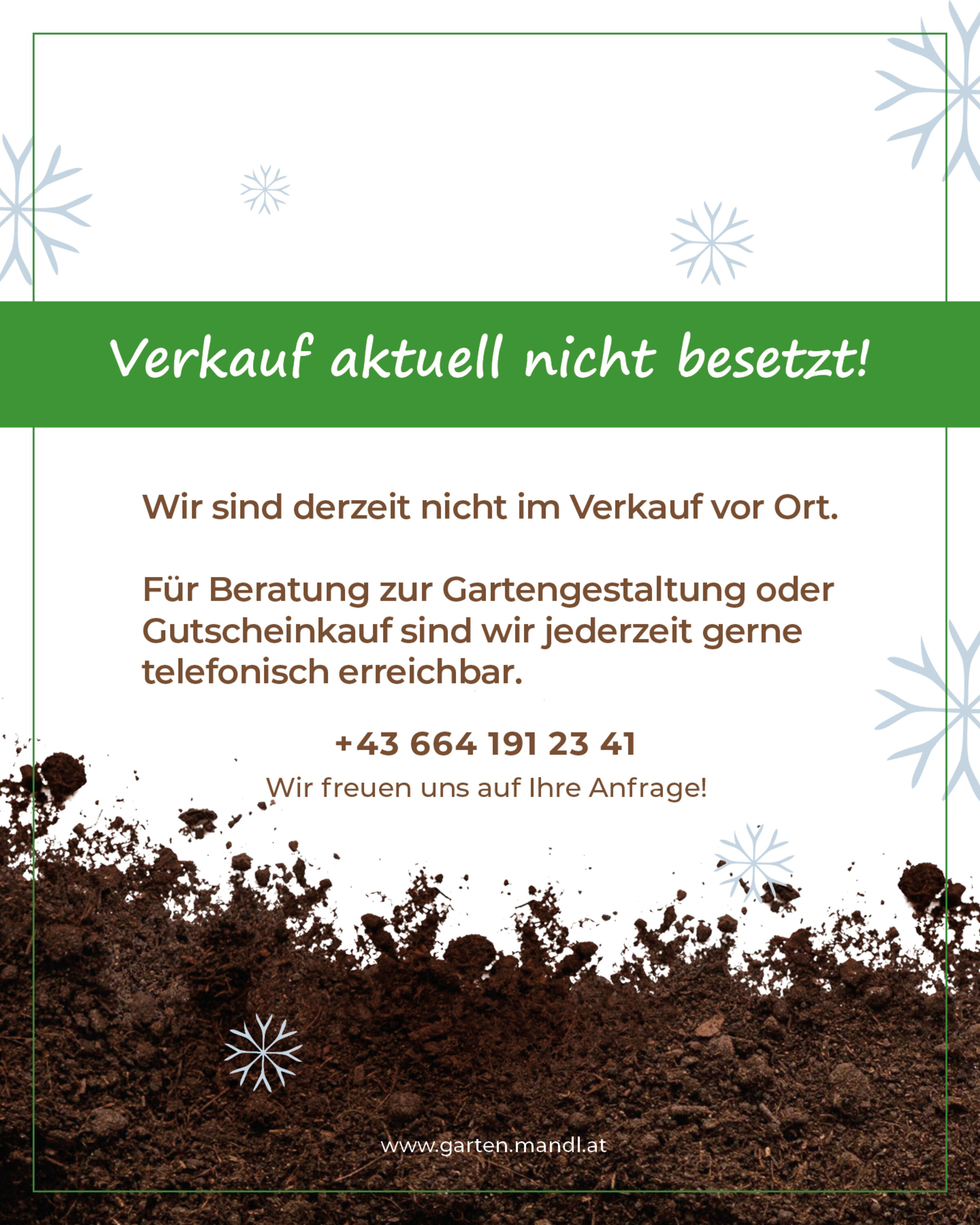 Für Beratung zur Gartengestaltung stehen wir weiterhin auch außerhalb der Öffnungszeiten zur Verfügung.