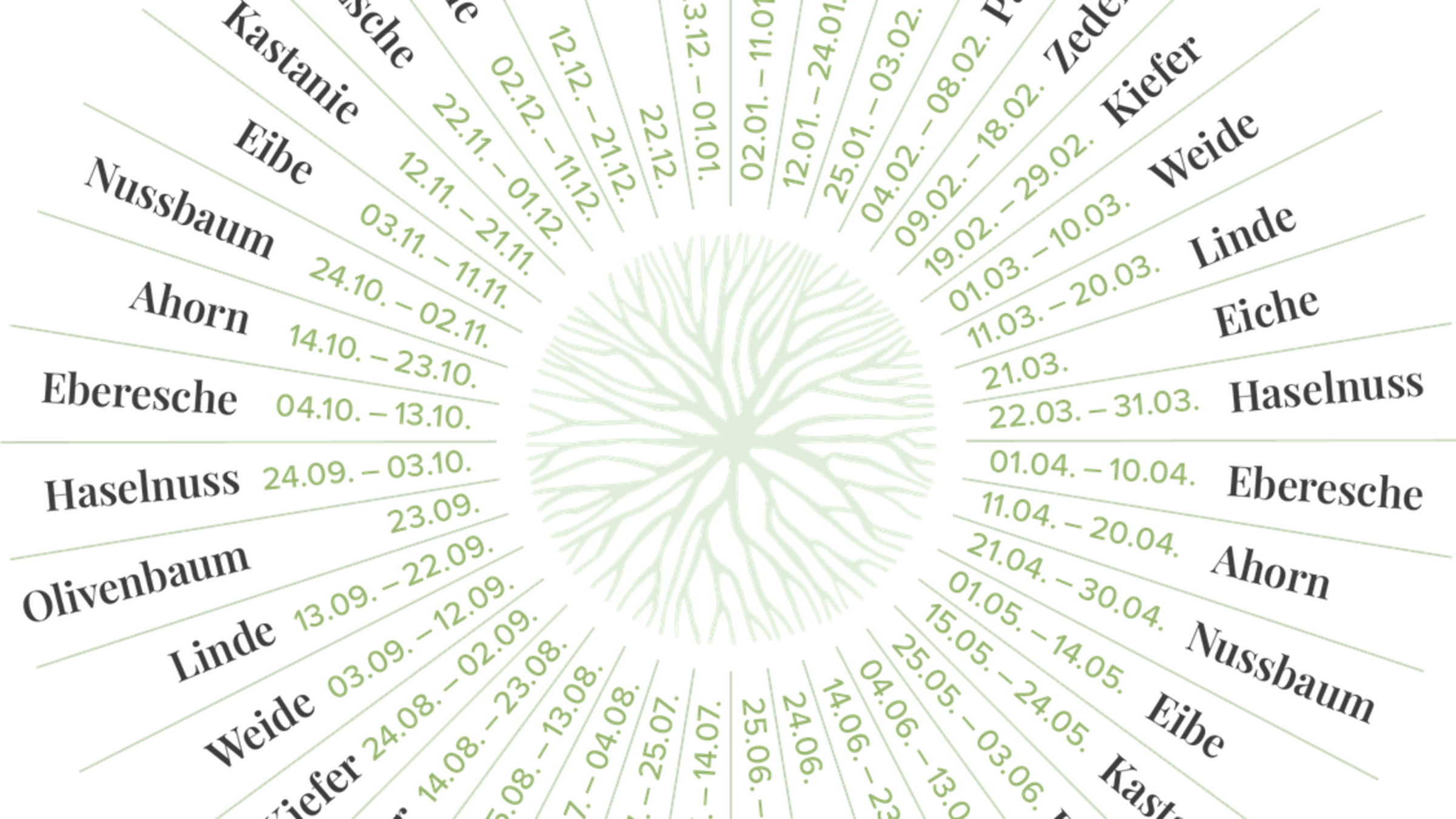Im keltischen Baumkreis ist jedem Menschen nach seinem Geburtsdatum einen Lebensbaum zugeordnet. Vier Hauptbäume markieren den Beginn der Jahreszeiten: Eiche, Birke, Olivenbaum und Buche.